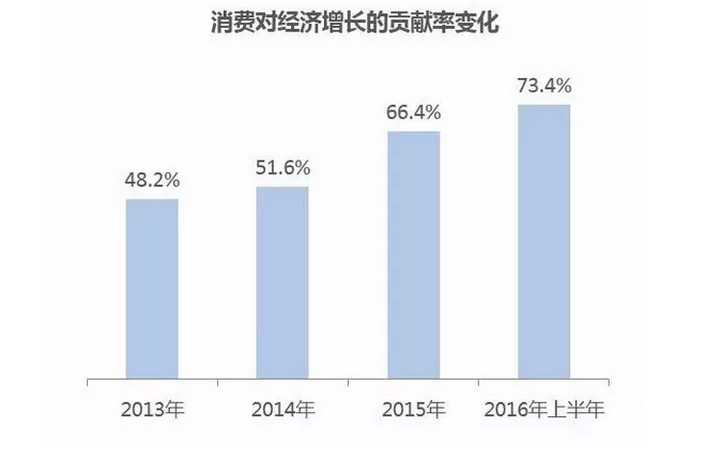 從 宏觀大環(huán)境來看,2016 年國民經(jīng)濟(jì)延續(xù) 2015 年的zhongg速增長,GDP 增速難以逾越 7% 大關(guān)。與此同時(shí),消費(fèi)占經(jīng)濟(jì)增長的比率逐年提升,2016 年上半年達(dá)到 73.4%,成為經(jīng)濟(jì)增長的重要引擎。在經(jīng)濟(jì)進(jìn)入zhongg速增長的新常態(tài)下,供給側(cè)改革創(chuàng)新與居民消費(fèi)升幾的趨勢顯現(xiàn)。